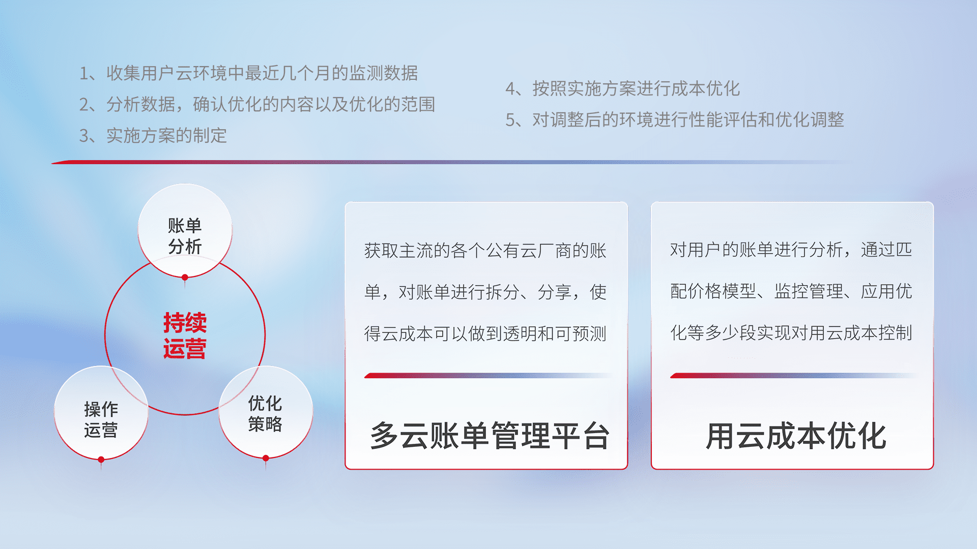 通过多云纳管,,,,以统一的资源数据模型把客户的云资源进行抽象和封装,,,,进而实现对多云资源的统一操作,,,,保障云资源管理的可靠性、、稳定性与可用性。。。量身定制化运维内容,,配置、、、、开发运维、、补丁管理、、备份、、、、监控、、、认证和访问管理、、、审计和日常巡检等,,,,保障在用云过程中的可靠度,,稳定度以及高可用率。。。